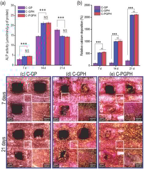 ALP activity of each scaffold is shown in Figure 6a. The ALP activity of HA-laden scaffolds (C-GPH and C-PGPH) was 1.6-fold (4.5 ± 0.2 and 4.6 ± 0.1 µmol/min/(µg of protein), respectively) higher at day 7 and 1.5-fold (21.2 ± 0.7 and 21.3 ± 0.5 µmol/min/(µg of protein), respectively) higher at day 14 than the ALP activity of the C-GP scaffold (2.9 ± 0.5 (7 d) and 14.6 ± 0.3 µmol/min/(µg of protein) (14 d), respectively) on the corresponding days. Figure 6b shows relative calcium deposition on each scaffold at 7, 14 and 21 days as assessed by ARS staining (Figure 6c–e). To measure calcium deposition induced by osteoblast-like-cells, we calculated the difference between the total calcium content in the cultured scaffolds and the original calcium content in the scaffold. Relative to the calcium deposition of C-GP scaffold at day 7 (100 ± 10.1%), the results of calcium deposition of HA-incorporated scaffolds (C-GPH and C-PGPH) showed 545.6 ± 94.7% and 563.3 ± 63.3% at day 7, 1012.9 ± 132.6 and 1027.6 ± 92.1% at day 14 and 2108.2 ± 236.7% and 2126.6% at day 21, respectively. Meanwhile, C-GP scaffold only had increase of calcium deposition of 114.4 ± 26.8% and 206.7 ± 17.4% at days 14 and 21 respectively.