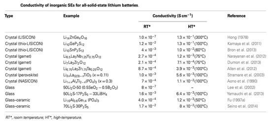 - Cao, C.; Li, Z.-B.; Wang, X.-L.; Zhao, X.; Han, W.-Q. Recent Advances in Inorganic Solid Electrolytes for Lithium Batteries. Front. Energy Res. 2014, 2, 2. [Google Scholar] [CrossRef]