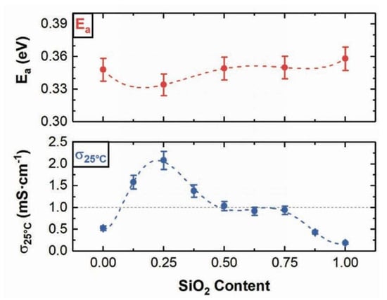 (Top) Activation energy and (bottom) room temperature ionic conductivity of aLi2S-B2S3-xSiO2-zLiI (LIBOSS) with varying silica content [].