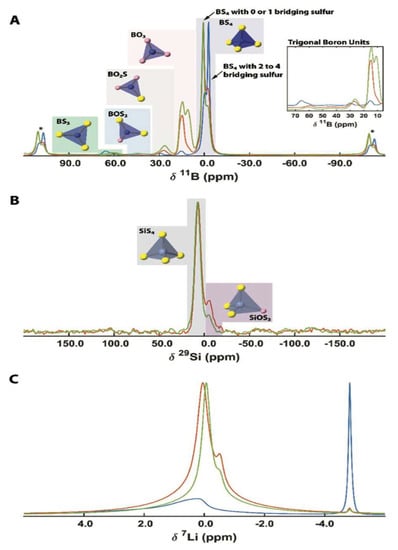 (A) 11B, (B) 29Si, and (C) 7Li magic angle spinning (MAS) spectra of LIBOSS for x = 0 (blue), x = 0.25 (orange), and x = 0.5 (green) [].