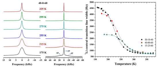(Left) Static 7Li NMR spectra with temperature in the 40–60 Li2S–GeSe2 glass. (Right) Motional narrowing of both the central transition (CT) peak is clearly seen at elevated temperatures [].