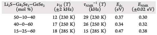 Plotting the 7Li NMR lineshapes for each glass reveals a characteristic sigmoid shape. The inflection point of these lineshape functions can give insight into how fast Li ions jump in the material, through calculation of the correlation time, . At the inflection point, the Li-ion jump rate can be estimated as , where is the inflection point linewidth []. Additionally, one can also approximate the activation energy for the Li ion jumps by finding the temperature at which this inflection occurs []. Marple et al. calculated hopping frequencies and their corresponding activation energies using this method, which are highlighted in Figure 5. These results were in close agreement with EIS derived hopping frequencies and activation energies. From this agreement, the authors argued that the hopping frequency corresponds to Li ion jumps between an average Li–Li separation distance and were able to estimate the DC conductivity using the Nernst–Einstein relation.