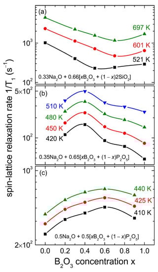 23Na Relaxation data as a function of Boron concentration in (a) borosilicate glasses and (b,c) various borophosphate glasses [].
