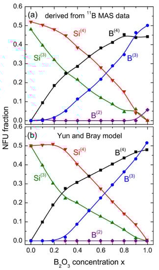 Network forming unit (NFU) fractions of sodium borosilicate glasses as determined (a) by 11B NMR, and (b) by the Yun and Bray model [].