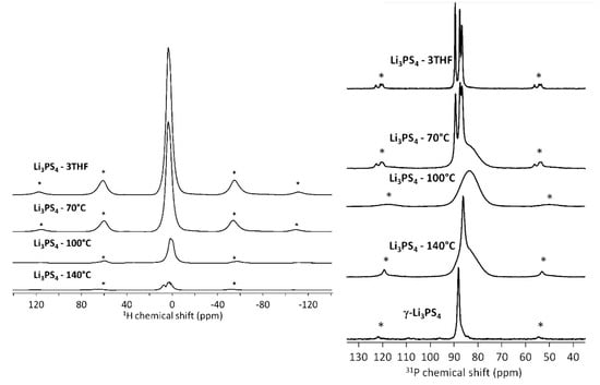 (Left) Proton MAS spectra of the Li3PS4 glasses treated at various temperatures. (Right) 31P MAS spectra of the same Li3PS4 glasses. The asterisks indicate spinning sidebands [].