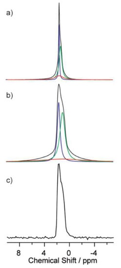 It is known that combinations of glass formers can lead to anomalously ionic conductivities, hereafter referred to as the “mixed glass former effect” (MGFE) [,,,,]. This effect can either drastically increase or decrease ionic conductivity, known as the positive and negative MGFE, depending on the compositions and concentrations of the glasses mixed. NMR lineshape and relaxation studies have been used to study this effect. Storek et al. looked at a series of glasses containing mixed concentrations sodium borosilicate and sodium borophosphate glasses, known to produce a negative and positive MGFE, respectively []. Using 23Na NMR spectra, they attempted to correlate short-range structural information with microscopic origins of the MGFE.