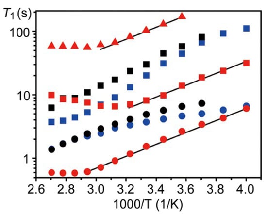 Plots of 6Li (triangle), 7Li (circle), and 31P (square) T1’s for 70 gc (red), 75 gc (blue), and 70 g (black). The solid line through 7Li T1 data points for 70 gc is the least-squares fit one to a straight line [].