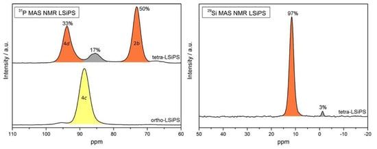 (Left) 31P NMR spectra of tetrahedral (top) and orthorhombic (bottom) LSiPS. (Right) 29Si NMR spectra of tetrahedral LSiPS [].