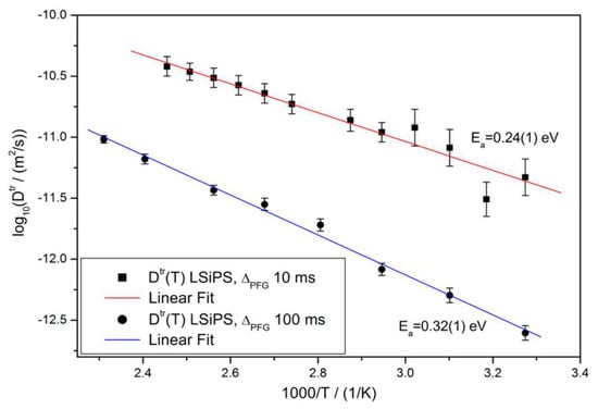 Arrhenius plots of variable temperature diffusion in tetra-LSiPS, at both 10 ms and 100 ms diffusion time [].