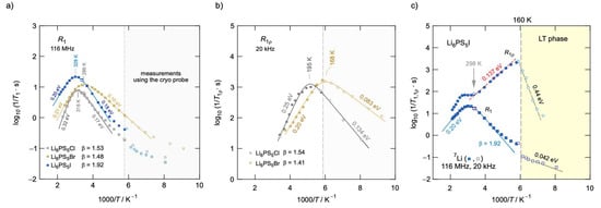 Arrhenius relaxation plots of Li6PS5X in the (a) lab frame of reference, (b) rotating frame of reference of 20 kHz, and (c) combined relaxation plots of Li6PS5I [].