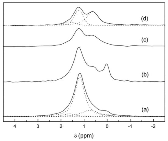 One group, Larraz et al. sought to elucidate the distribution of Li ions in LLZO, as the 7Li isotropic chemical shifts tend to fall in a narrow window in these materials, making it difficult to resolve separate peaks []. This difficulty is further compounded by the presence of 7Li dipolar broadening, which is still present when performing MAS. In addition, the exposure of these crystals to air allows for proton-lithium exchange and for new secondary phases and impurities to form, such as LiOH and Li2CO3 which further compound the problem [,]. To work around this, the group synthesized LLZO using enriched 6Li, to allow for much more resolvable spectra. These crystals were then purposefully exposed to air by annealing to allow for proton-Li exchange in order to vary the Li content in the octahedral and tetragonal sites of the crystal.