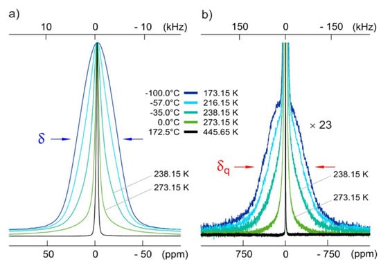 Figure 18 highlights the lineshapes of the 7Li spectra as a function of temperature. From the lineshapes, the authors discovered a near homogeneous motional narrowing, compared to Al-doped LLZO. From the intensities of the quadrupolar interactions (~300 kHz) in the lineshapes, and the subsequent vanishing at higher temperatures, the authors also deduced that the Li ions were extremely mobile, with mean jump rates of at least 106 s−1. By performing SLR measurements in the lab and rotating frame of reference, they found the same mean activation energy of ~0.29 eV, lower than that of tetragonal LLZO [,], suggesting high Li ion diffusion. From these plots, they were also able to estimate the Li self-diffusion coefficient using the Einstein–Smoluchowski (ES) relation [] to be about 10−15 m2/s.