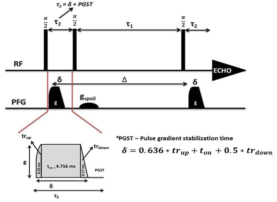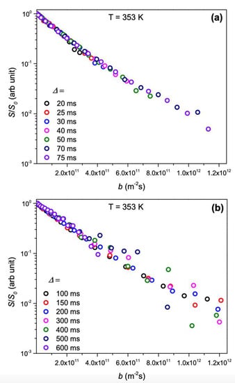 - Stejskal, E.O.; Tanner, J.E. Spin Diffusion Measurements: Spin Echoes in the Presence of a Time-Dependent Field Gradient. J. Chem. Phys. 1965, 42, 288. [Google Scholar] [CrossRef]