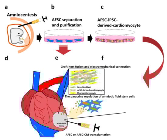 It was confirmed that the AFSCs can be reprogrammed into iPSCs, which can differentiate into cardiomyocytes that express MHC class I and lack MHC class II molecules. They also possess the specific electrophysiological properties and spontaneous contraction of cardiomyocytes. Transplanted AFSC-iPSC-CMs survived in the infarcted area of the rat heart and restored heart functions after myocardial infarction. Thus, AFSC-iPSC-CMs are potential therapeutic products for the treatment of ischemic heart disease [21]. It was reported that intramyocardial transplantation of AFSCs in the infarcted rat hearts would improve post-infarct cardiac function, but only a small number of the transplanted AFSCs could survive in the hearts and differentiate into endothelial cells and smooth muscle cells [53]. Moreover, these transplanted AFSCs minimally differentiated into cardiomyocyte. Thus, apart from differentiating into cardiomyocytes, AFSCs also provide mechanical contractility to the host heart and may also repair the injured hearts through paracrine signaling [53,54,55]. Furthermore, how to diminish post-transplant rejection in an allogeneic or xenogeneic environment should be a key issue of successful allogeneic stem cell therapy.