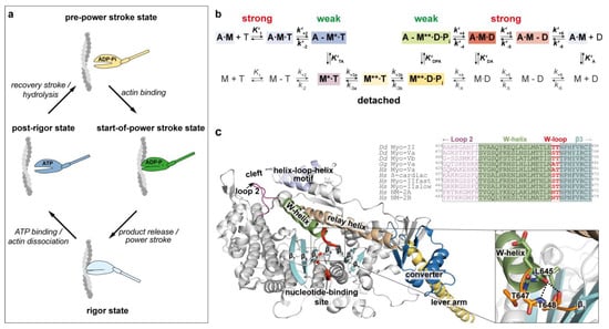 The ATP-driven mutual interplay between myosin and actin drives muscle contraction and many other forms of cellular motility, including cytokinesis and directional cargo transport; yet, our molecular understanding of how these two cytoskeletal proteins communicate with each to generate force still remains incomplete [1,2]. In a simplified view, actomyosin-based force production can be described with a four-state model, firstly formulated by Lymn and Taylor [3]. The model qualitatively illustrates the nucleotide-dependent conformational transitions of myosin during the cyclic traversing from actin-attached to actin-detached states (Figure 1a). While strongly bound to actin (rigor state), ATP binding to the myosin motor domain weakens the association with actin by a several 1000-fold decrease in affinity [4] and the motor dissociates rapidly and irreversibly adopting an intermediate state known as post-rigor [5,6,7]. Preceding ATP hydrolysis, the neck region of myosin—an elongated α-helical region adjacent to the motor domain with bound light-chains known as lever-arm—is set to an up position. The conformation is referred to as the pre-power-stroke state [8,9,10]. The myosin subsequently reattaches to actin with increasing affinity, adopting a structurally yet not assessed intermediate conformation assigned as the start-of-power-stroke state [11,12]. The existence of this state has been predicted from kinetic and modeling data and postulated to be required for strengthening the association with actin, which in turn triggers product release and forces myosin to perform the key event of force production, the power stroke—a swinging motion of the lever-arm from the up to the down position [11,13,14,15,16,17,18].