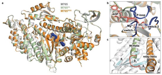 X-ray crystal structures of the Dd myosin-2 motor domains of wildtype myosin M765 (pdb:1VOM) and mutant myosins M765AA (pdb:7B1A) and M765GGG (pdb:7B19) in complex with ADP∙VO42−. (a) Superposition of the structures. M765 (white), M765AA (green), M765GGG (orange). The nucleotide is shown in blue. (b) Close-up view of the nucleotide-binding pocket. The active site elements switch-1, switch-2, and P-loop adopt the same conformation in wildtype and mutants. (c) Close-up view on the W-helix/transducer region. In the M765GGG structure (orange) small conformational shifts are visible for the β3, β5, and β7 sheets of the transducer (cyan) and the C-terminal end of relay helix (orange). The longer W-loop in M765GGG prevents proper β3-sheet formation.