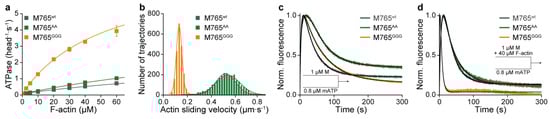 To investigate the functional consequences of the altered ATPase of M765GGG, we performed in vitro motility assays (Figure 3b). Since all constructs were equipped with an artificial lever composed of two α-actinin repeats [45], we were able to directly compare motor performances using standard in vitro motility assays independent of potential influential effects induced by the light chains [46]. M765GGG displayed a fourfold reduced actin translocation speed (vavg = 0.13 ± 0.01 µm∙s−1) compared to 0.52 ± 0.02 µm∙s−1 and 0.54 ± 0.01 µm∙s−1 for M765wt and M765AA, respectively. Two scenarios are conceivable for the reduced motility. Either the mutation affects a pathway that prevents a full swing of the lever-arm, e.g., by disturbing converter rotation, which would reduce the working stroke and consequently result in slower motility or the mutation influences individual kinetic steps in the cycle that affect the motile behavior, e.g., population of strongly actin-bound states [47].