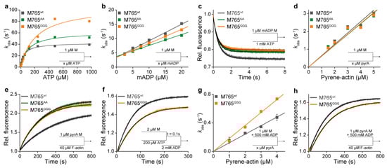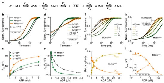 This unexpected high ADP-affinity of M765GGG in the actin-bound state prompted us to repeat the ADP-inhibition experiments using reduced levels of ATP, which allowed us to determine the second order rate constant of ADP binding to actomyosin (k’−5K’6) and the rate of the transition from A∙M∙D to A∙M-D (k’+5), which determines the rate of ADP release [54]. The biphasic transients (Figure 5h) followed a hyperbolic dependence with respect to rate of the slow phase (kobsslow) (Figure 5i) and a linear dependence with respect to rate of the fast phase (kobsfast) (Figure 5i, inset). Linear and non-linear fitting yielded the parameters k’+5 and k’−5K’6 summarized in Table 4, revealing more than a sixfold deceleration in ADP release kinetics for M765GGG (k’+5 = 16 s−1), in a time range typically observed for high-duty-ratio class-5 myosins [55,56,57].
