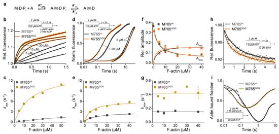 The same actin titration experiments performed under single turnover conditions showed a biphasic behavior for both, wild-type and M765GGG (Figure 6d). The fast phase was dependent on actin, which allowed the determination of the Pi release rate (k’+4) under saturating actin conditions. This was obtained from the hyperbolic dependency of the observed rates according to kobs = k’+4[actin]/(1/K’DPA+[actin]) (Figure 6e). Under these single turnover conditions, the kinetics of the slow phase are limited by the rate of ATP binding (since low ATP concentration were used) and are thus independent of actin (Figure 6g). Both, single and multiple turnover experiments reveal a comparable, actin concentration-dependent steep increase in the actin-activated Pi release kinetics. The initial slope provides a measure for the second order binding constant of actin to M∙D∙Pi. The data reveal almost 20-fold increased second order rate constants of M∙D∙Pi binding to actin (k’+4K’DPA) for M765GGG (Figure 6c,e). Plots of the corresponding amplitudes of the fast and slow phases under single turnover conditions reveal a reciprocal hyperbolic dependency on actin for wildtype and M765GGG. The amplitudes report the amount of liberated Pi.