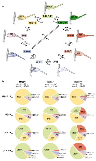 To corroborate the interpretation of the results, we simulated the fractional occupancy of the main intermediate ATPase states of the cycle (Figure 7a) using the experimentally obtained kinetic parameters and equilibrium constants exemplary for four actin concentrations ([A] = 0.1Kapp, 1Kapp, 3Kapp and 20Kapp) under conditions of excess ATP (10 mM). The simulations have previously been applied to allow comparisons of the state occupancies between fast and slow muscle myosin isoforms [59]. The parameters used for the simulations are summarized in Table 5. The results are shown as pie charts in Figure 6b with the corresponding values listed in Table 6.