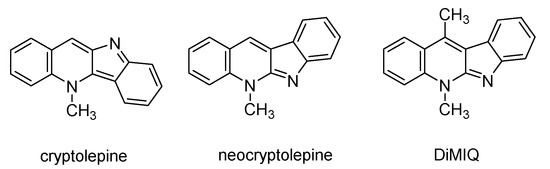 - Larghi, E.L.; Bracca, A.B.J.; Aguilar, A.A.A.; Heredia, D.A.; Pergomet, J.L.; Simonetti, S.O.; Kaufman, T.S. Neocryptolepine: A Promising Indoloisoquinoline Alkaloid with Interesting Biological Activity. Evaluation of the Drug and its Most Relevant Analogs. Curr. Top. Med. Chem. 2015, 15, 1683–1707. [Google Scholar] [CrossRef]