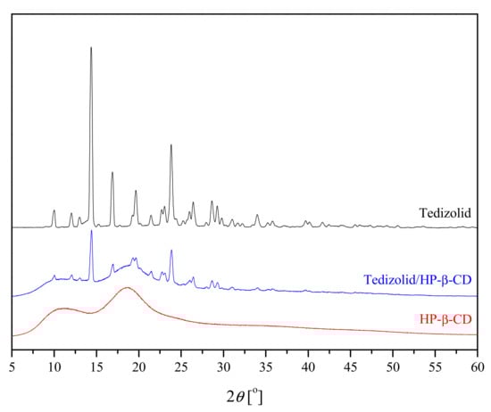 The following XRPD, differential scanning calorimetry (DSC) and FT-IR techniques with theoretical calculations were used as methods to confirm the identity of the obtained system. Pure tedizolid, HP-β-CD and their solid system obtained by kneading were characterized using powder X-ray diffraction (PXRD). The PXRD patterns, shown in Figure 1, revealed the crystalline nature of the parent tedizolid, as demonstrated by sharp Bragg peaks at 10.0°, 12.4°, 14.4°, 16.9°, 19.6°, 22.7°, 23.8°, 26.4°, 28.6°, and 29.2° 2θ, while the HP-β-CD starting material has an amorphous nature. The binary system diffractogram is a sum of patterns of each individual phase (pure tedizolid and HP-β-CD).