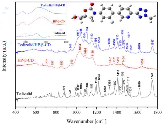 The Figure 3 shows the FT-IR spectrum for the tedizolid, HP-β-CD and inclusion complex of tedizolid/HP-β-CD. The FT-IR spectra of tedizolid include significant vibrations at 879 cm−1 (C-H wagging), 1619 cm−1 (C=C stretching + C-C stretching in phenyl ring), 3259 cm−1 (symmetric C-H stretching in phenyl ring) in the (Pyridine-3-yl)phenyl-3-fluoro structure, 1223 cm−1 (C-O stretching vibrations, 1328 cm−1 (C-H wagging), 1410 cm−1 (C-H wagging and C-N-C bending vibrations), 1747 cm−1 (C=O stretching vibrations) in the 1,3-oxazolidin-2-one structure and 1196 cm−1 (C-H wagging in pyridine ring and C-C-N bending vibrations in the (Pyridine-3-yl)phenyl-3-fluoro structure []. The FT-IR spectra of HP-β-CD consisted of the prominent absorption band of the 1034 cm−1 (C-C stretching vibrations), 1085 cm−1 (C-O stretching vibrations), 1158 cm−1 (symmetric C-O-C stretching vibrations), 1654 cm−1 (H-OH bending vibrations), 2973 cm−1 (symmetric and a symmetric C-H stretching vibrations in CH2 and CH3 groups in in hydroxypropyl parts) and 3411 cm−1 (OH stretching vibrations). Furthermore, in the range of 1200–1500 cm−1 there are bands associated with bending vibrations of C-H and O-H bonds [,,,,].
