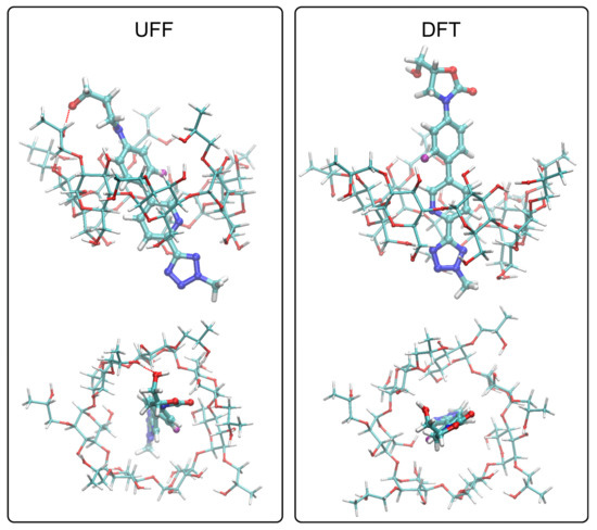 The analysis of the DFT-optimized tedizolid/HP-β-CD complexes provided an insight into the qualitative pattern of interactions that may be the binding driving force as well as into the preferred spatial arrangement of the bound ligand molecule into the cavity of HP-β-CD. The graphical illustration of the considered structures is given in Figure 4. The two alternative structures of HP-β-CD differ mainly by the orientation of their most flexible parts, i.e., the hydroxypropyl moieties. We decided to consider both DFT and UFF structures due to the fact that in the case of physical systems, the orientation of the substituents is expected not to be conformationally locked but, conversely, they can adopt various geometries with the associated dynamic equilibrium established through conformational rearrangements occurring within several picoseconds. This is likely to be correlated with the coexistence of multiple binding modes, differing mainly by the pattern of interactions of the tedizolid molecule with HP moieties.