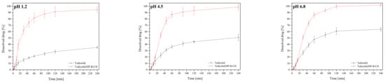 The solubility of tedizolid phosphate is the highest when the drug is fully deprotonated (high pH) and lowest when fully protonated (low pH), with a steep increase in solubility between pH 4.0 and pH 6.0 []. The active substance, tedizolid phosphate-free base, has limited aqueous solubility and is stable across a pH range of 3 to 8 []. The changes in the dissolution rate of parent tedizolid, as well as tedizolid/HP-β-CD complex, confirm a positive solubility effect of cyclodextrin; however, the presence of HP-β-CD did not change the dissolution profile shape (Figure 5). Calculated f1 and f2 values confirmed that the dissolution profile of the tedizolid/HP-β-CD complex is very different from parent tedizolid in three dissolution media (f1/f2 values: 27.99/3.17, 98.19/3.57, and 68.89/10.03 at pH 1.2, 4.5 and 6.8, respectively). Interestingly, the speed of the dissolution of the tedizolid/HP-β-CD complex was from twice (at pH 4.5 and 6.8) up to three times higher (pH 1.2) compared with the parent tedizolid. Such different dissolution profiles show the potential of cyclodextrins as substances that significantly modify tedizolid release, especially in the gastric environment. Based on these findings, despite the absence of other oxazolidinones studies, confirm the usefulness of using cyclodextrin to increase the solubility of other sparingly water-soluble antibiotics, e.g., tebipenem pivoxil from the carbapenem group [].