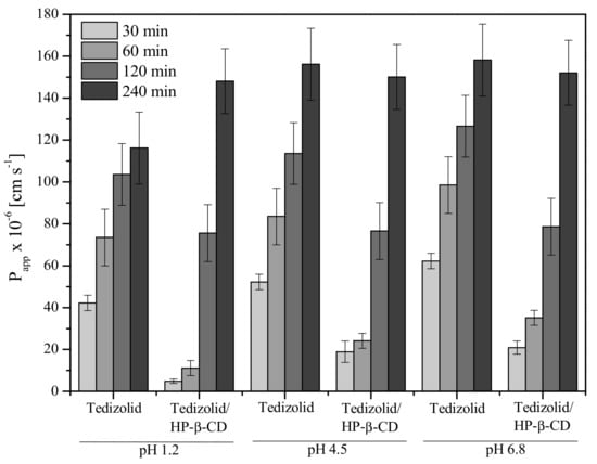 The ability of tedizolid to penetrate biological membranes under the digestive tract condition was tested using the parallel artificial membrane permeability assay (PAMPA system). Tedizolid, classified to II BCS class, as a poorly water-soluble drug, shows high permeability. As expected, permeability studies using the PAMPA system, through the gastrointestinal barrier, confirmed that the apparent permeability coefficients for the parent tedizolid and its inclusion complex with HP-β-CD were higher than 1 × 10−6 cm s−1, classifying all of them as high-permeability systems (Figure 6) []. It confirmed the previous in vitro studies, where tedizolid has high permeability across Caco-2 monolayers, which suggests that tedizolid may enter into hepatocytes primarily via passive diffusion []. Tedizolid phosphate has low membrane permeability and the stomach does not contain phosphatase enzymes, therefore in vitro studies suggest that tedizolid phosphate is dephosphorylated in the intestinal brush border membrane, after which tedizolid enters the enterocytes without accumulation in the intestinal lumen []. What is interesting, parent tedizolid permeates faster in the first 120 min. After that time, there was no significant difference in the apparent permeability coefficient for tedizolid and tedizolid/HP-β-CD. This confirms the hydrophilic nature of the complex is not favored by passive penetration. High penetration of the complex at 240 min may be due to the high degree of dissolution of tedizolid and confirms the sense of prolonged use of the drug.