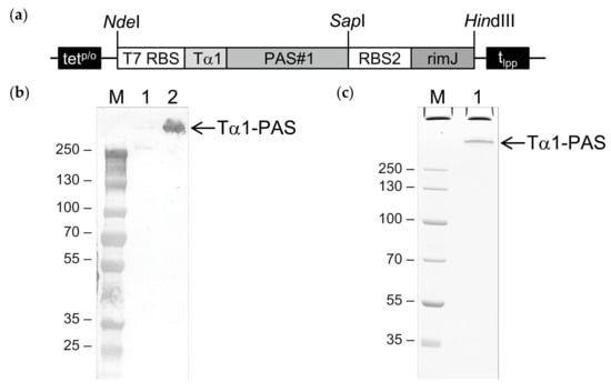 The whole cell lysate was analyzed prior to and 15 h after induction by Western blotting. Using a monoclonal antibody that recognizes an epitope of the PAS#1 sequence, a distinct band with an approximate molecular size above 250 kDa was detected (Figure 1b), which demonstrated successful bacterial expression of the full-length C-terminally PASylated Tα1 (Tα1-PAS) without signs of degradation. Of note, the unusually slow migration of Tα1-PAS (52.7 kD) in sodium dodecyl sulfate polyacrylamide gel electrophoresis (SDS-PAGE) is well known for PASylated proteins [31,37] and can be explained by the poor binding of SDS (which provides the electrophoretic driving force) to the strongly hydrophilic PAS sequence.