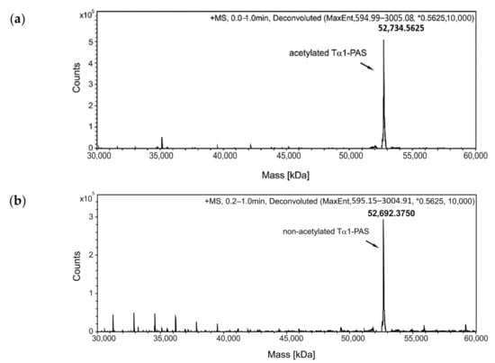 The protein solutions were dialyzed against a citrate buffer at pH 3.0 and subsequently applied to a strong cation exchange (CEX) column, which resulted in a bound fraction for PAS-Tα1, whereas both a flow-through fraction and a bound fraction were observed for Tα1-PAS (Figure 2). Electrospray ionization mass spectrometry (ESI-MS) analysis of Tα1-PAS in the flow-through revealed a molecular mass of 52,734.56 Da (Figure 2a), which exactly matches the calculated mass for the N-terminally acetylated gene product (52,734.56 Da). In this case, the start methionine of Tα1-PAS (followed by a Ser residue) was fully processed, presumably by the bacterial methionine aminopeptidase [39], then followed by N-terminal acetylation via RimJ. In contrast, the column-bound peptide fraction, which was eluted using a salt concentration gradient, showed a molecular mass of 52,692.38 Da (Figure 2b), which corresponds to the calculated mass for the non-acetylated processed polypeptide (52,692.54 Da) accompanied by some minor peaks below 40 kDa, most likely due to residual host cell impurities. Accordingly, this CEX step enabled separation of the desired N-acetylated Tα1-PAS from its non-acetylated precursor as a result of a single charge difference. In comparison, the fully column-bound non-acetylated PAS-Tα1 showed a single molecular mass of 52,789.8 Da (Figure 3) corresponding to the intact peptide, again, lacking the start methionine.