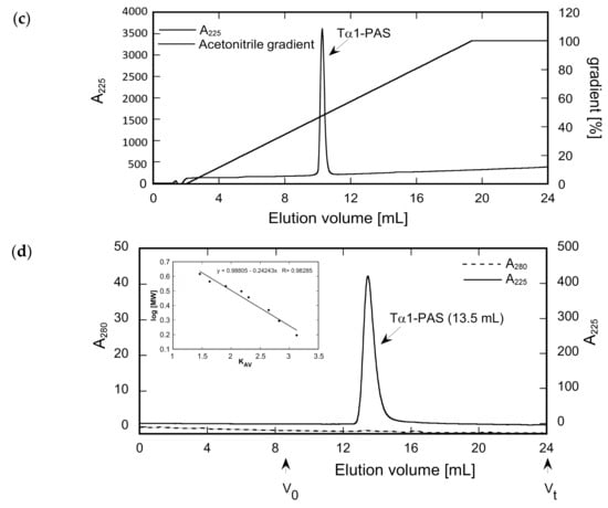 In the present study, we applied the PASylation® technology in order to overcome both of these obstacles of the currently available Tα1 drug and to create a long-lasting N-terminally acetylated therapeutic peptide, also offering cheap and efficient biotechnological production in E. coli. To this end, we combined fusion with a 600-residue polypeptide comprising the small natural L-amino acids Pro, Ala, and Ser [31] with in situ N-acetylation by overexpressing the host cell N-acetyltransferase RimJ [32]. The genetically encoded uncharged “PAS” sequence is highly soluble and structurally disordered, with an expanded hydrodynamic volume, thus showing a biophysical behavior very similar to the chemical polymer polyethylene glycol (PEG), which has been utilized for plasma half-life extension of a series of other therapeutic peptides and proteins [33,34,35].