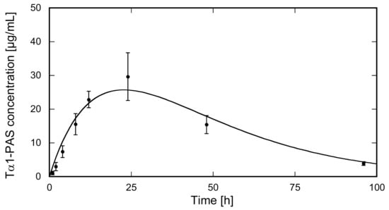 To mimic the clinically approved route of Zadaxin™ administration, the N-acetylated Tα1-PAS was injected subcutaneously into the dorsal area of rats (N = 5). The injected dose of 3.4 mg/kg Tα1-PAS was well tolerated without any drug-related adverse events or significant changes in body weight. The Tα1-PAS plasma levels at various sampling times were analyzed using a quantitative sandwich ELISA developed to detect only Tα1-PAS and no endogenous rat Tα1, which shares 100% sequence identity with the human peptide. The pharmacokinetic (PK) profile of Tα1-PAS (Figure 4) exhibited a typical curve according to the Bateman function [40], with a Cmax of 25.6 ± 4.4 mg/L at tmax = 22.7 ± 1.1 h. Curve fitting with the WinNonlin software revealed a drastically extended terminal half-life of 15.9 ± 0.9 h, which is more than 8-fold longer than the one for the native peptide (τ1/2 = 1.9 h) published for rats [41]. The strong impact of PASylation on the PK profile is also reflected by other parameters such as the large area under the curve (AUC) and slow clearance (CL) (Table 1).