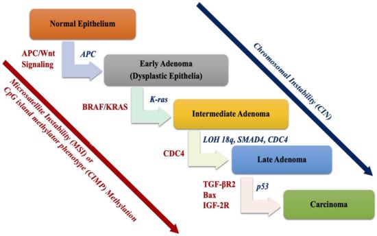 On the other hand, genetic and epigenetic alterations are involved in events that lead to the initiation of neoplastic transformation of healthy epithelium that progresses toward the malignant stages; in 1990, Fearon and Vogelstein defined the genetic paradigm of CRC formation [10]. In their multistep genetic model, formation of CRC occurs due to accumulation of several genetic and epigenetic alterations in key genes involved in silencing of TSGs and activation of oncogenes [10,11,12]. In this regard, two major pathways were defined for CRC formation. One pathway involves inhibiting tumor suppressor genes’ (TSGs) expression and adenomatous polyposis coli (APC). This comprises 85% of all CRC and is mutated in the germline of patients with FAP. The other pathway is via mutational inactivation of proteins involved in MMR (MSH2, MLH1, and PMS2) and accounts for around 15% of all sporadic cases and HNPCC syndrome [10,11,12]. The different pathways are characterized by distinctive models of genetic instability, subsequent clinical manifestations, and pathological characteristics [11,12]. However, the majority of CRC cases follow the chromosomal instability (CIN) pathway, characterized by an extensive loss of heterozygosis (LOH) and gross chromosomal abnormalities [13,14].