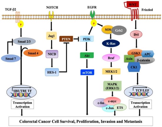 The epidermal growth factor receptor (EGFR) belongs to the ErbB/HER family and consists of four members; ErbB1 (EGFR/HER1), ErbB2 (Neu/HER2), ErbB3 (HER3), and ErbB4 (HER4) [146,147]. Activation of EGFR pathway, triggers several downstream intracellular signaling pathways, including the RAS/RAF/MEK/ERK, PI3K/AKT, and JAK/STAT3 pathways to regulate cell growth, survival, and migration [148,149,150]. Deregulated EGFR expression is present in various cancers including CRC [146]; increased EGFR expression is present in 25–77% of CRC cancers [151,152]. Activation of EGFR induces RAS-RAF activation, which leads to phosphorylation of mitogen-activated protein kinase (MAPK or MEK) and activation of extracellular signal-related kinase (ERK) [153,154].