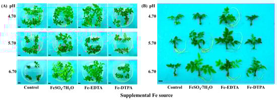 Fe application is particularly important in micropropagation. Boamponsem [17] found that the fresh weight and area of callus growth decreased with an absence of Fe in the growth medium in potato, and the texture of the calli was slightly soft and brittle. Similarly, in micropropagation of Vitis, Fe-deficiency in the medium greatly affected the fresh weight of calli regardless of the genotype of Fe efficiency. Moreover, as the Fe applied to the leaves is transported from the stomata to the phloem, it will be absorbed by the parenchyma cells surrounding the substomatal chambers [18], which is limited by the rate of transpiration and the top is not a priority supply. Therefore, the most obvious symptom of associated Fe deficiency is stunted growth and induction of chlorosis in the youngest leaves. During the regeneration of the axillary shoots of Nicotiana benthamiana over 4 weeks, numerous plants showed leaf chlorosis associated with Fe deficiency. After these plants were transferred to the MS medium containing double strength Na2FeEDTA, they quickly recovered from chlorosis and turned healthily green [19]. The results of the current study exhibited strongly enhanced S. commixta growth with supplementary FeSO4, Fe-EDTA, and Fe-DTPA in the multipurpose medium. The supplemental Fe enhanced the number of leaves and root formation after 6 weeks of culture. In addition, the solubility of the Fe sources varies in different pHs because Fe chelates differ in their ability to withstand displacement of their metal. When the pH is lower than 5.5, FeSO4 has a high solubility, which quickly decreases with increasing pH [20,21]. At high pH, however, Fe-DTPA has higher soluble Fe than Fe-EDTA did [22]. In this study, the promotion of plant growth by supplemental Fe was affected by the Fe source and pH. All the observations indicated that the utilization of supplemental FeSO4 and Fe-EDTA with a low pH, and supplemental Fe-DTPA at pH 6.70, could promote the growth and development of S. commixta in vitro, and decrease chlorosis.