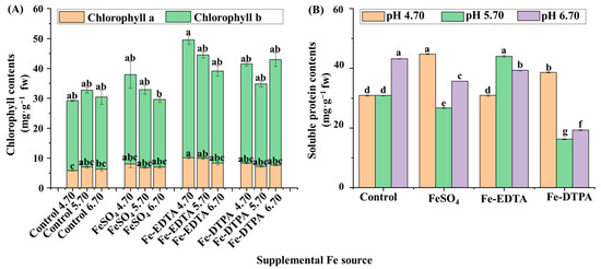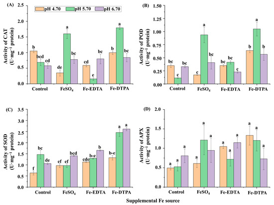 The chlorophyll contents decreased with the increase of the medium pH in treatments with FeSO4 and Fe-EDTA, and the highest chlorophyll a and b contents were found in the treatment with Fe-EDTA at pH 4.70 (Figure 2A). Higher soluble protein contents were observed in plants grown in the control at pH 6.70, with FeSO4 at pH 4.70, and with Fe-DTPA at pH 5.70, and these values were 2.5 times that with Fe-DTPA at pH 5.70 (Figure 2B). The CAT activity was greater in the treatments at pH 5.70 with FeSO4 and Fe-DTPA, which were respectively 9.6 and 10.8 times than that in the control at pH 5.70 (Figure 3A). Similarly, the POD activity was greater in the treatments at pH 5.70 with FeSO4 and Fe-DTPA, which were respectively 7.4 and 8.4 times higher than that in the control at pH 5.70 (Figure 3B). The SOD activity increased with the increase in the medium pH regardless of the Fe source, and the SOD activity in plants grown with Fe-DTPA at pH 6.70 was 4 times than that of the control at pH 4.70 (Figure 3C). There were no significant differences in the APX activity among treatments with different supplementary Fe sources (Figure 3D).