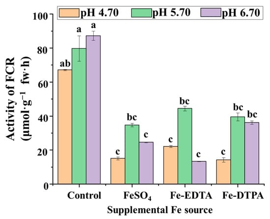 The results of this study showed that FCR activities in the control group were 2 to 4 times that in treatments supplemented with different Fe sources, which indicates that FCR activities decrease with Fe supplementation (Figure 4). Among the treatments with FeSO4, Fe-EDTA, and Fe-DTPA, the highest FCR activities were observed at pH 5.70. FCR activities in the treatment with Fe-DTPA at pH 6.70 resulted in the second highest FCR activities among the treatments. The FCR activities were similar among treatments with FeSO4 at pH 4.70 and 6.70, with Fe-EDTA at pH 4.70 and 6.70, and with Fe-DTPA at pH 4.70.