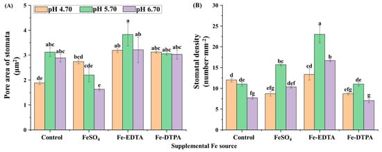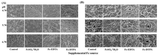 Stomata is a basic plant-specific organelle for transpiration and respiration, and Fe significantly affected the stomatal size and upper epidermis thickness of leaves [43,44]. Fe-deficiency caused a smaller stomatal size on the leaf surface, decreased the degree of stomatal opening, and affected the gas exchange of plants [45]. In this study, stomatal density increased with supplementary Fe treatments regardless of the Fe source in pH 5.70. It indicates that Fe and pH influence stomatal density simultaneously. However, supplementary Fe had no significant effects on the stomatal area. It is speculated that the plant may store enough Fe in the stem before transplanting to support the development of stomata.
