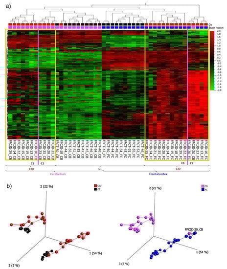 Based on the 265 most variably expressed genes across all the samples included in the study (Supplementary material S1a, a list of the 265 genes), the following main patterns were observed: (1) primary separation between the frontal cortex (FC) and cerebellum (CB) samples, and (2) secondary separation of sCJD from control tissue samples (Figure 1a,b).