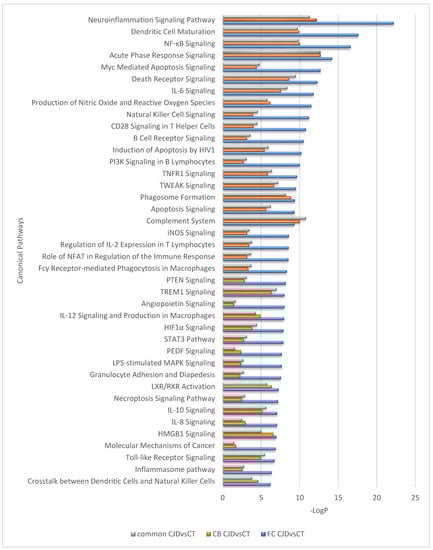 Top 40 canonical pathways regulated differently between the sCJD and control samples but overlapping between the sCJD FC and CB.