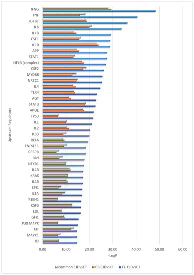 Top 40 upstream regulators predicted differently between the sCJD and control samples but overlapping between the sCJD FC and CB.