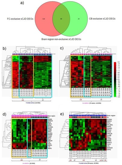 sCJD FC and CB specific gene profiles. (a) Graphic number visualization of DEGs that are exclusive and common to sCJD FC and CB samples. (b) Clustering of FC sCJD and control samples based on the 116 FC-associated genes signature. (c) Incomplete clustering of the CB sCJD and control samples based on the 116 FC-associated genes signature. (d) Clustering of CB sCJD and control samples based on the 20 CB-associated genes signature. (e) Poor clustering of FC sCJD and control samples based on the 20 CB-associated genes signature. Yellow frame indicates clusters of the same type samples; blue frame highlights the main clusters indicated by unsupervised hierarchical clustering; yellow arrow heads indicate samples out of their clusters.
