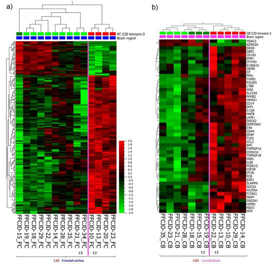 Heatmap and unsupervised two-way hierarchical clustering based on (a) 181 DEG between FC sub-cluster 1 (C1) and sub-cluster 2 (C2). (b) 50 DEG between CB sub-cluster 1 (C1) and sub-cluster 2 (C2). CJD—sporadic Creutzfeldt–Jakob disease; FC—frontal cortex; CB—cerebellum.