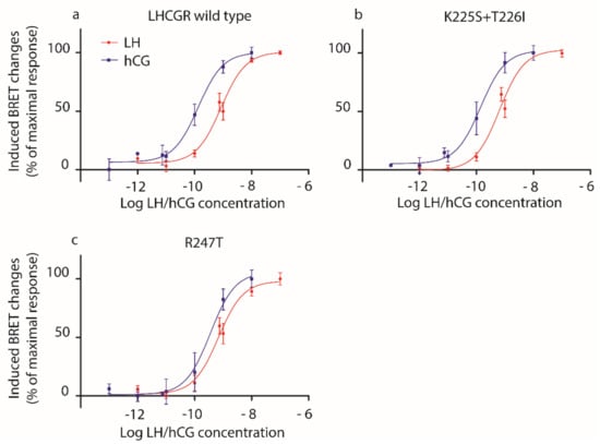LH- and hCG-induced cAMP response in HEK293 cells overexpressing (a) wild type LHCGR, (b) the K225S + T226I or (c) the R247T mutants. HEK293 cells were transiently transfected with mutant or wild type LHCGR- and CAMYEL-expressing plasmids. Bioluminescence resonance energy transfer (BRET) changes were measured after treating cells 30 min with increasing concentrations of LH or hCG (1 pM–100 nM range) in the presence of 3-isobutil-1-methylxanthine (IBMX). Moreover, 50 µM forskolin served as a positive control. Data were interpolated by non-linear regression and expressed as percentage of the maximal response (means ± SEM; n = 4).
