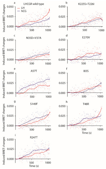 LH- and hCG-induced pERK1/2 activation. In HEK293 cells transiently overexpressing (a) the wild type receptor, (b) the K225S + T226I, (c) the N35D + V37A, (d) the E270V, (e) A57T, (f) I83S, (g) the S149F, (h) the T48R or (i) the R247T mutants, the kinetics of ERK1/2 phosphorylation was analyzed. Induced BRET changes obtained thanks to the interaction between the REV BRET-biosensor and pERK1/2 were measured over 1200 s upon administration of 100 pM LH or hCG. Data from LH/hCG-treated cells were represented by locally weighted scatterplot smoothing (LOWESS) of the induced BRET changes. All the LH- vs hCG-induced kinetics of ERK1/2 phosphorylations are different, except those mediated by the K225S + T226I and I83S mutants (Kruskal–Wallis test and Dunn’s Multiple Comparison post-test; p ≥ 0.05; each point is the mean value from eight independent experimental replicates).
