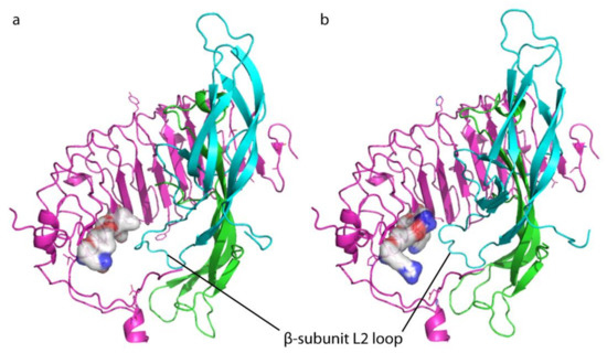 Comparison between mouse and human receptor extracellular leucine-rich-repeat domain (LRRD) bound to the heterodimeric hormone (α and β subunit). (a) Images were obtained using hCG sequence as a template for the hormone, as previously described [3], and the α and β subunits are indicated with the colors green and light blue, respectively. Receptor LRRD is pink, while the murine and human LRR11 residue at positions 247, as well as the adjacent residues at position 225 and 270, are indicated by bubbles. mLhr LRRD- and (b) LHCGR LRRD-hCG complexes. The hormone β-L2 loop might potentially interact with these different, key residues of rodent and human receptors.