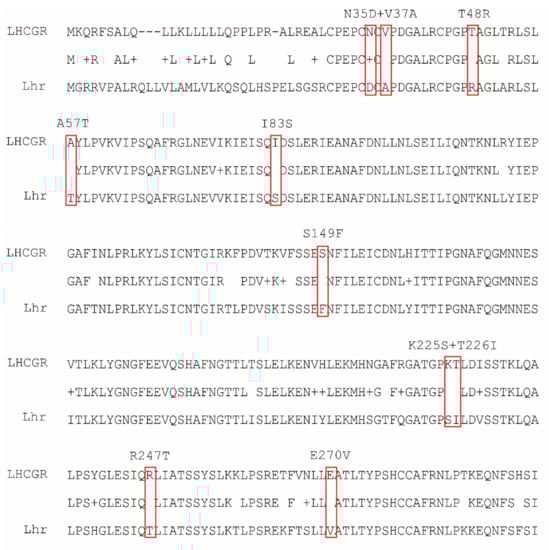 Alignment of LHCGR and Lhr aminoacidic extracellular domain sequences (1–300 aa), using the single-letter code for each amino acid. LHCGR amino acids in positions 35 and 37, 48, 57, 83, 149, 225, and 226, 247, 270 were substituted by mutagenesis with the corresponding murine amino acid (red boxes), as these are residues possibly involved in LH-hCG recognition [14].