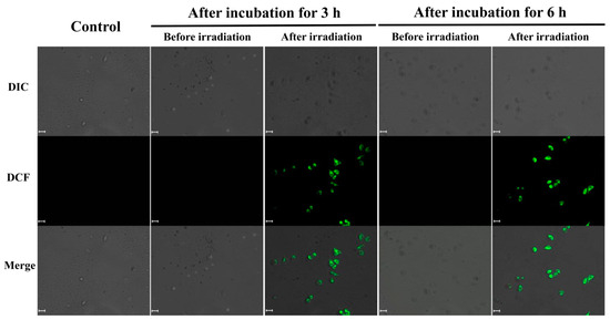 As irradiation-induced generation of ROS by a photosensitizer is crucial to PDT, 2,7-dichlorofluorescein diacetate (DCFH-DA) was employed as a marker to assess the production of ROS using confocal laser scanning microscopy (CLSM). In living cells, DCFH-DA is converted to DCFH, which is oxidized to fluorescent (green) 2,7-dichlorofluorescein (DCF) in the presence of ROS [42,53]. Confirmation of ROS generation is a crucial element of assessing the effectiveness of PDT. As shown in Figure 3, non-irradiated HeLa cells incubated with DOX/5-ALA-loaded A-PPG micelles (1.5 μg/mL) for 3 h and 6 h did not exhibit green DCF fluorescent staining. In contrast, cells incubated with the same micelles that were irradiated for 120 s exhibited intense green DCF fluorescence. Phua et al. [20] described how a prodrug-based supramolecular nanosystem led to the appearance of green fluorescence in cells after 4 h incubation with photosensitizer-loaded nanoparticles. In contrast, our system led to slightly more rapid appearance of green fluorescence, after 3 h. These results suggest that DOX/5-ALA-loaded A-PPG led to rapid generation of ROS within the light-irradiated cells, due to the synergistic ability of external light stimuli to generate ROS and the acidic intracellular environment of cancer cells to dissociate the hydrogen-bonded adenine dimers and disrupt the micellar structures.
